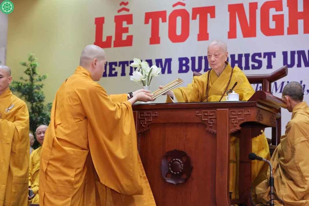 Lễ tốt nghiệp, vẫn đang trong mùa bão lũ nên mọi thứ đơn giản lắm, chỉ vài pano để Học viên chụp hình lưu niệm với người thân, và các nghi thức căn bản nhất. Trong lời tri ân của Học viên tốt nghiệp, họ xác định “Không chỉ học để biết, mà học để tu, học để sống, học để phụng sự”. Mục tiêu này được Thầy Phó Viện trưởng gửi gắm thêm: “Sau khi tốt nghiệp, tinh tấn tu tập hơn, lấy đây làm tư lương để tiếp tục hoằng pháp lợi sinh”. Nghe thì đơn giản, nhưng có khi phải dùng cả một đời hoặc nhiều đời để thực hiện.
