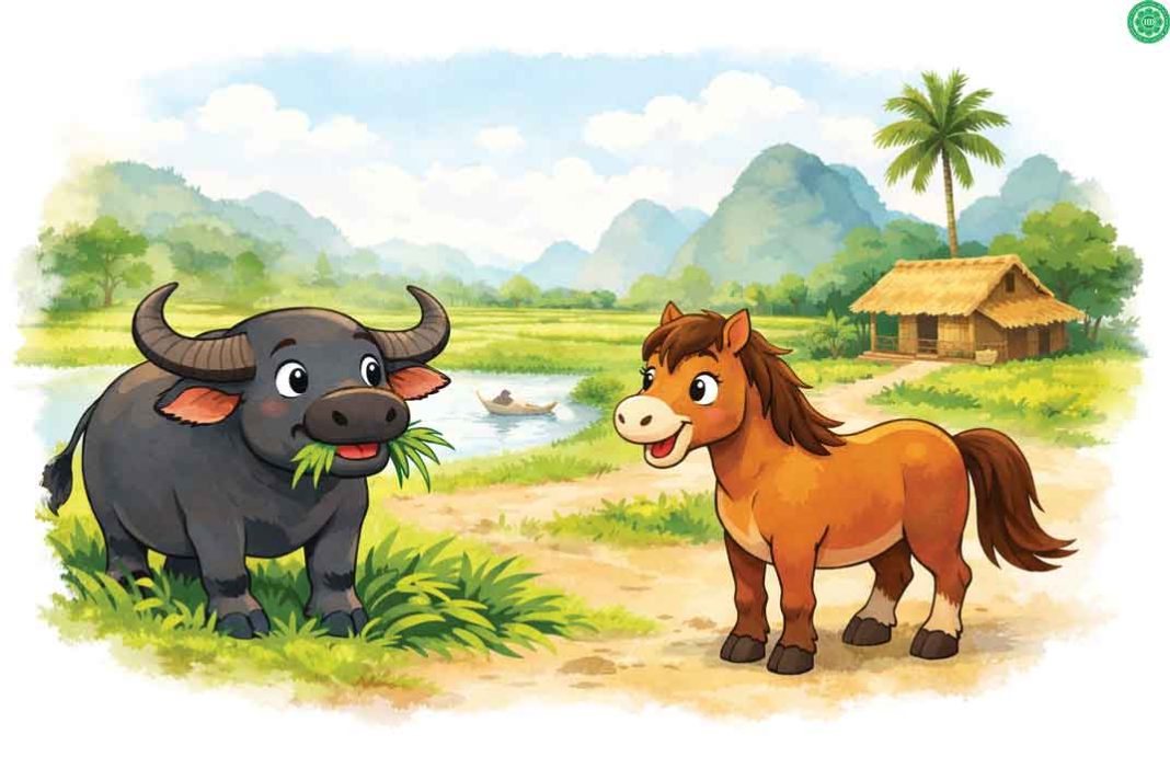 Trên cánh đồng, Trâu và Ngựa đang ăn cỏ. Bỗng Ngựa hất hàm, hỏi Trâu: