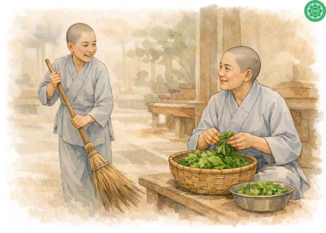 Sư cô Diệu Viên vẫn ngồi tước từng chiếc lá, mắt khẽ ngước nhìn cô tiểu, ánh mắt hiền mà sâu, như đã thấy qua bao nhiêu đứa nhỏ từng sốt ruột giống vậy. Sư cô mỉm cười, giọng chậm rãi, ngọt ngào nhẹ nhàng: