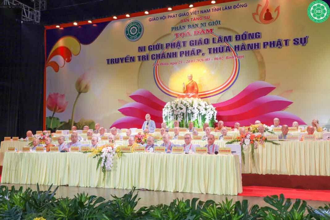Tiếp nối không khí trang nghiêm của lễ dâng hương tưởng niệm Đức Thánh Tổ Ni Đại Ái Đạo vào buổi sáng tại chùa Phước Huệ, chiều 23/3/2026, trong khuôn khổ Đại lễ tưởng niệm Đức Thánh Tổ Ni Đại Ái Đạo và chư Tôn đức Ni tiền bối hữu công Phật giáo Việt Nam, tọa đàm với chủ đề “Ni giới truyền trì Chánh pháp – Thừa hành Phật sự” đã diễn ra tại Quảng trường Lâm Viên, TP. Đà Lạt.