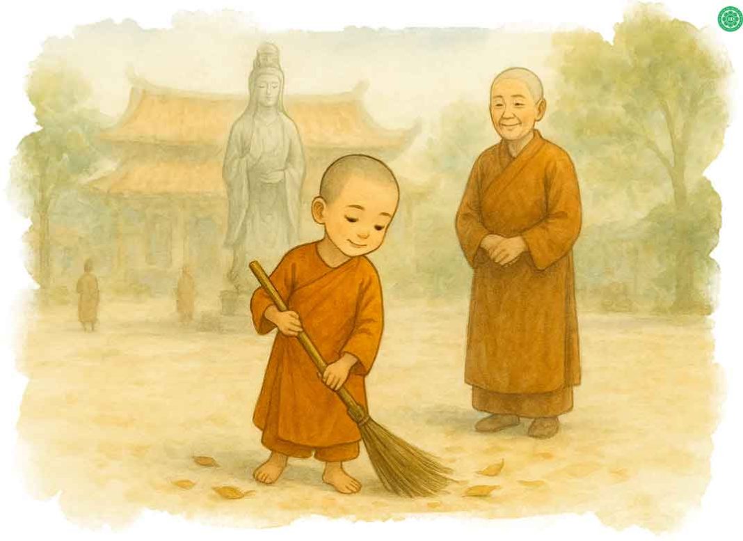 Chùa nằm nép mình bên con đường đất, bao quanh là hàng tre rì rào. Mùa An cư kiết Hạ đã trôi qua gần ba tháng, tiếng kinh tụng sớm tối đều đặn như hơi thở. Trong chùa, hai cô tiểu nhỏ – Tiểu Thanh và Tiểu Ngọc – đang quét lá. Những chiếc lá bàng vàng rụng đầy sân, tiếng chổi tre xào xạc trên nền gạch.