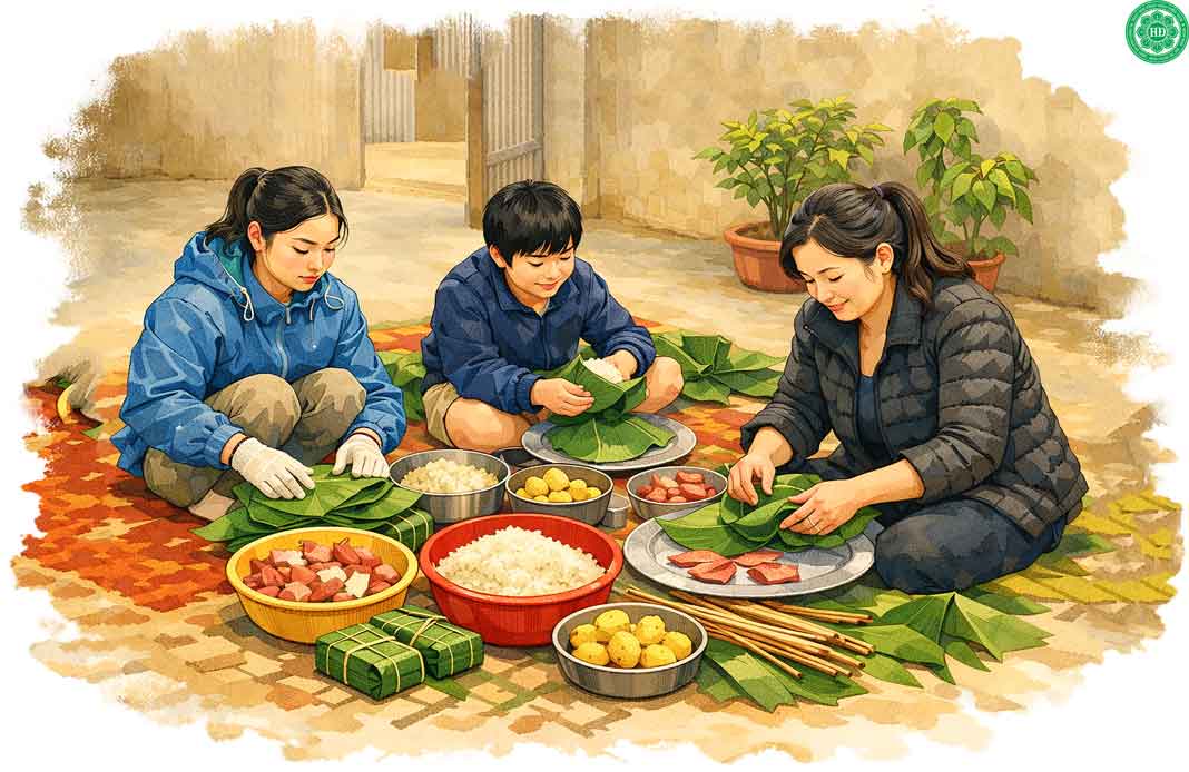 Ngày xưa nhà mình nghèo lắm, nhưng đó là cái nghèo chỉ có trong gia đình biết thôi. Người ngoài nhìn vào vẫn nghĩ gia đình mình no ấm lắm. Người vén khéo chu toàn mọi việc trong nhà chính là mẹ mình. Cứ mỗi năm Tết đến mẹ mình lại gói bánh tét, không phải để ăn đâu mà là bán lại cho cô Tư mình kiếm chút lời để chi tiêu trong những ngày đầu năm mới. Cứ khoảng 25 – 26 tháng Chạp mẹ bắt đầu xé lá chuối, lau lá, chuẩn bị dần mọi thứ để đến 27 là bắt đầu gói bánh. Thời gian ấy cũng là lúc hai chị em mình được nghỉ Tết nên cũng giúp mẹ được chút ít. Cả gia đình 4 người: Mẹ, ba, hai chị em mình cứ làm quần quật liên tục từ 27 đến 30 Tết. Cực nhọc nhất là mẹ, vừa gói, vừa nắn nhân, vừa coi nấu bánh. Bánh của mẹ gói ngon lắm. Mình thích nhất là lúc nắn nhân, thỉnh thoảng lại vón một cục đậu xanh béo ngậy, thơm lừng cho vào miệng, nhắm mắt lại và thưởng thức hương vị tuyệt vời chỉ có vào những ngày trước Tết. Bạn hàng của cô Tư cũng rất thích bánh mẹ làm. Năm nào cũng đặt hàng gói bánh muốn rã rời người luôn. Họ đặt nhiều loại lắm: Bánh nhưn chuối, đậu xanh, thịt mỡ, thập cẩm, lạp xưởng, trứng vịt nữa,… mà loại nào cũng trên cả tuyệt vời luôn. Mình thích nhất lúc vớt bánh ra, mẹ luôn cắt một đòn bánh ra thử, mùi thơm của nếp mới, đậm đà của đậu xanh, béo ngậy của mỡ, cùng hòa quyện vào nhau tạo nên mùi vị không thể nào quên. Cho đến tận bây giờ tôi vẫn chưa nếm được bánh tét nào giống như mẹ tôi đã làm. Tuy cực khổ là vậy, lời lãi chẳng bao nhiêu, nhưng đối với gia đình tôi lúc đó có còn hơn không, được thêm đồng nào để chi tiêu cho ngày Tết là tốt rồi.